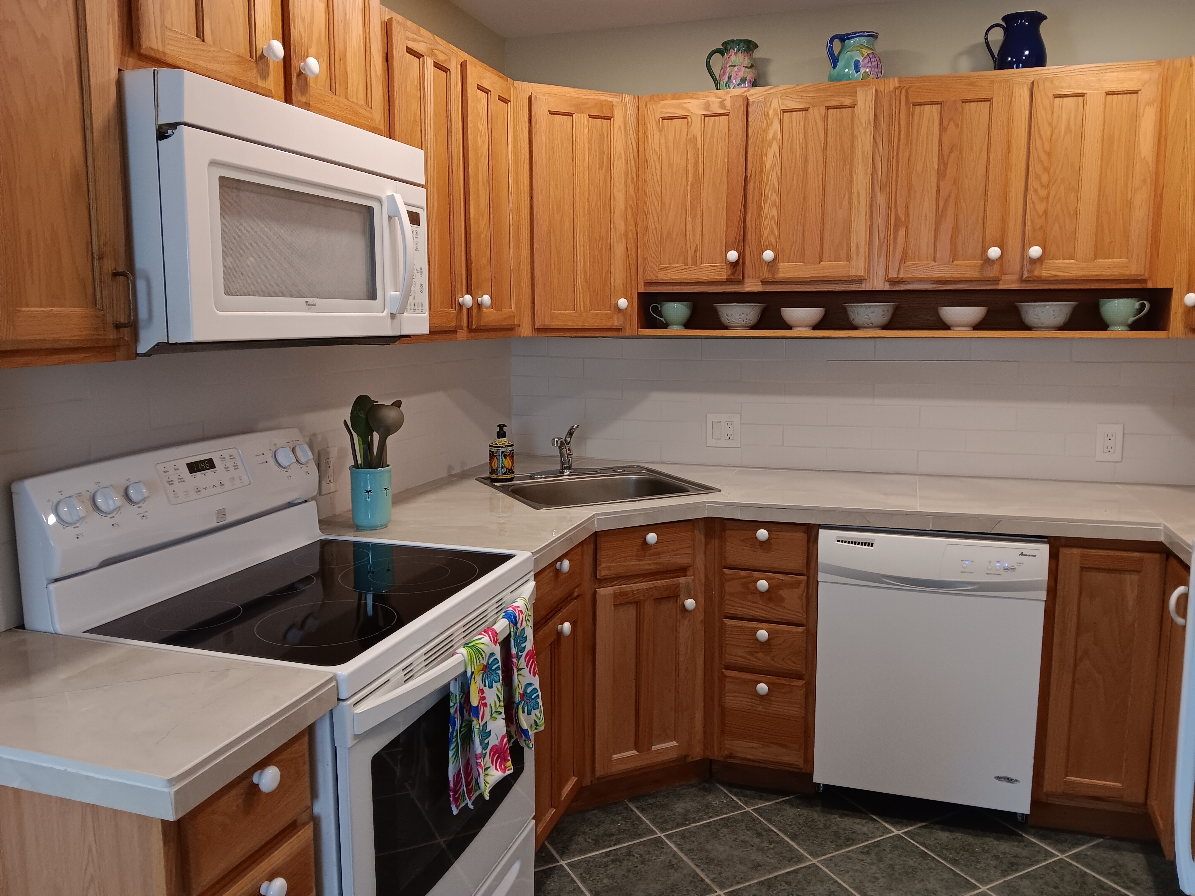 varnished oak floors and an updated kitchen. It is fully furnished with kitchen dishes and cooking utensils,